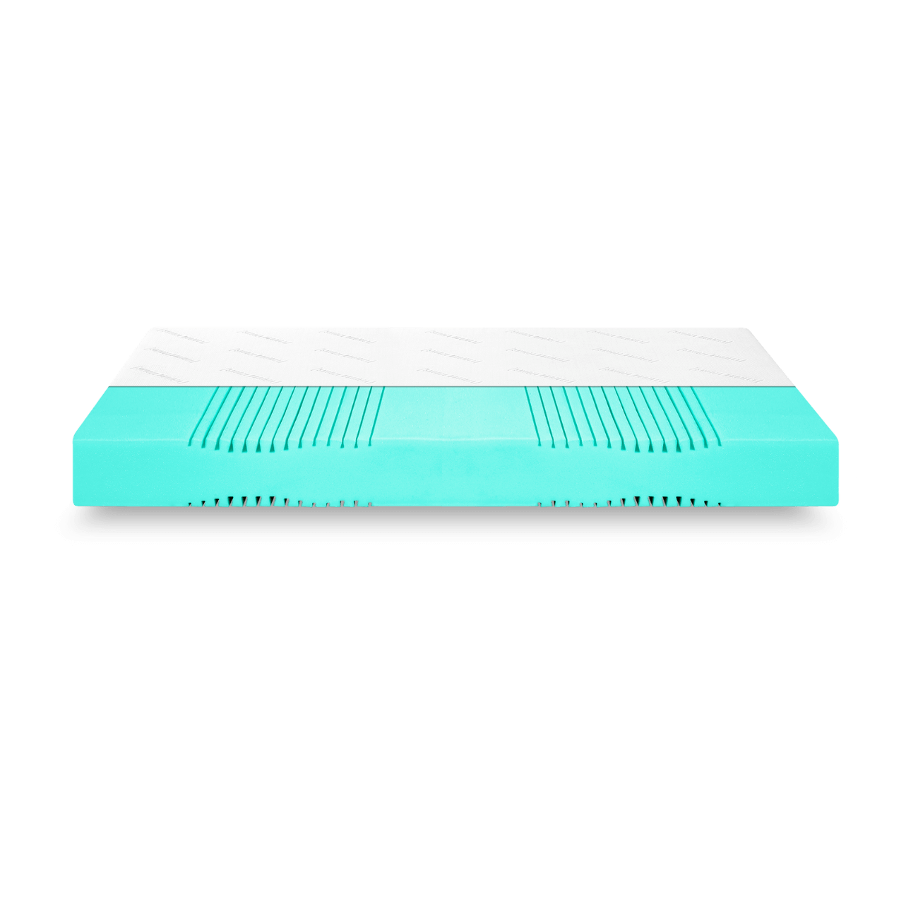 Eine rechteckige Matratze mit weißer Oberseite und türkisfarbenen Seiten, dargestellt aus einem niedrigen, nach vorne gerichteten Winkel. Die Matratze weist an den Seiten horizontale, schlitzartige Rillen auf.